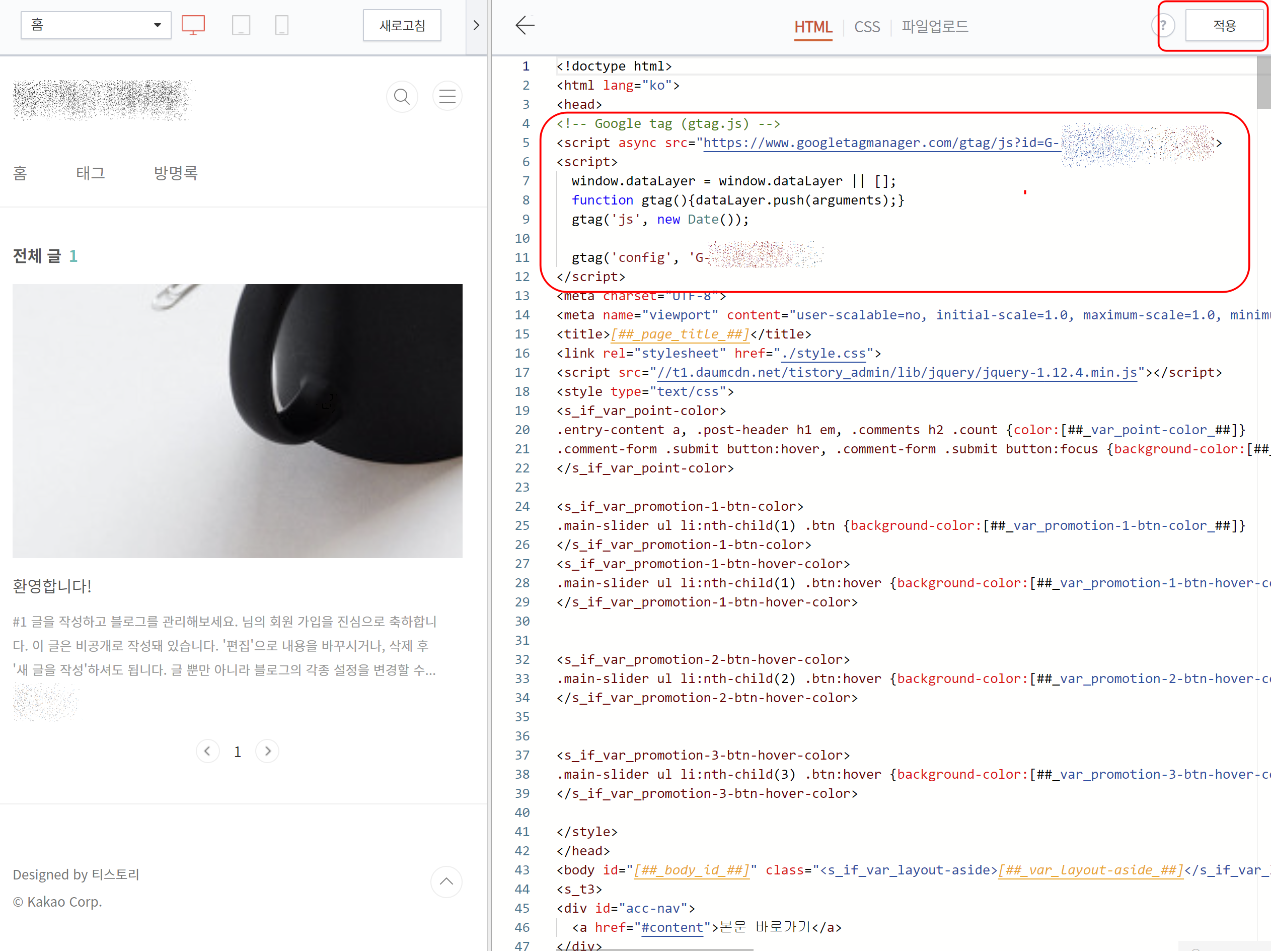 편집창을 열면 바로 <head> 보이면 <head> 밑에다 붙어 넣기를 하시면 됩니다.