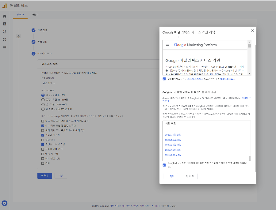 대한민국으로 변경하시고 2군데 선택하시고 동의를 하시면 구글 애널리틱스의 설정은 끝났습니다.