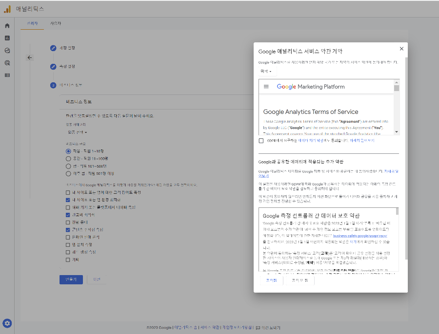 대한민국으로 변경하시고 2군데 선택하시고 동의를 하시면 구글 애널리틱스의 설정은 끝났습니다.